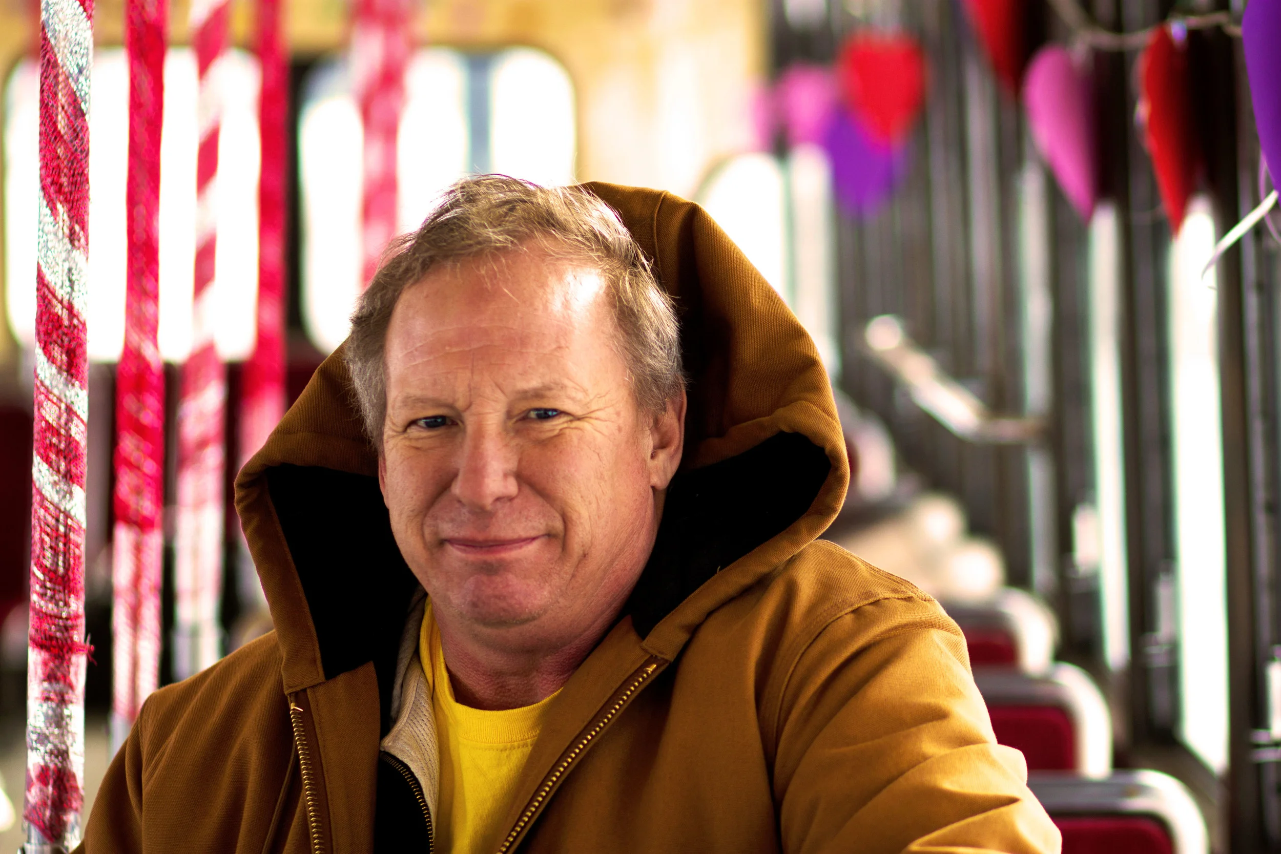 Inside Preston’s red, 1951 Presidents’ Conference Committee streetcar, cheerful hearts hang from the ceiling.Metal support poles are lovingly converted to mouth-watering peppermint sticks. Giant hearts on the front and back of the streetcar deliver a message of love as the streetcar loops around the track.